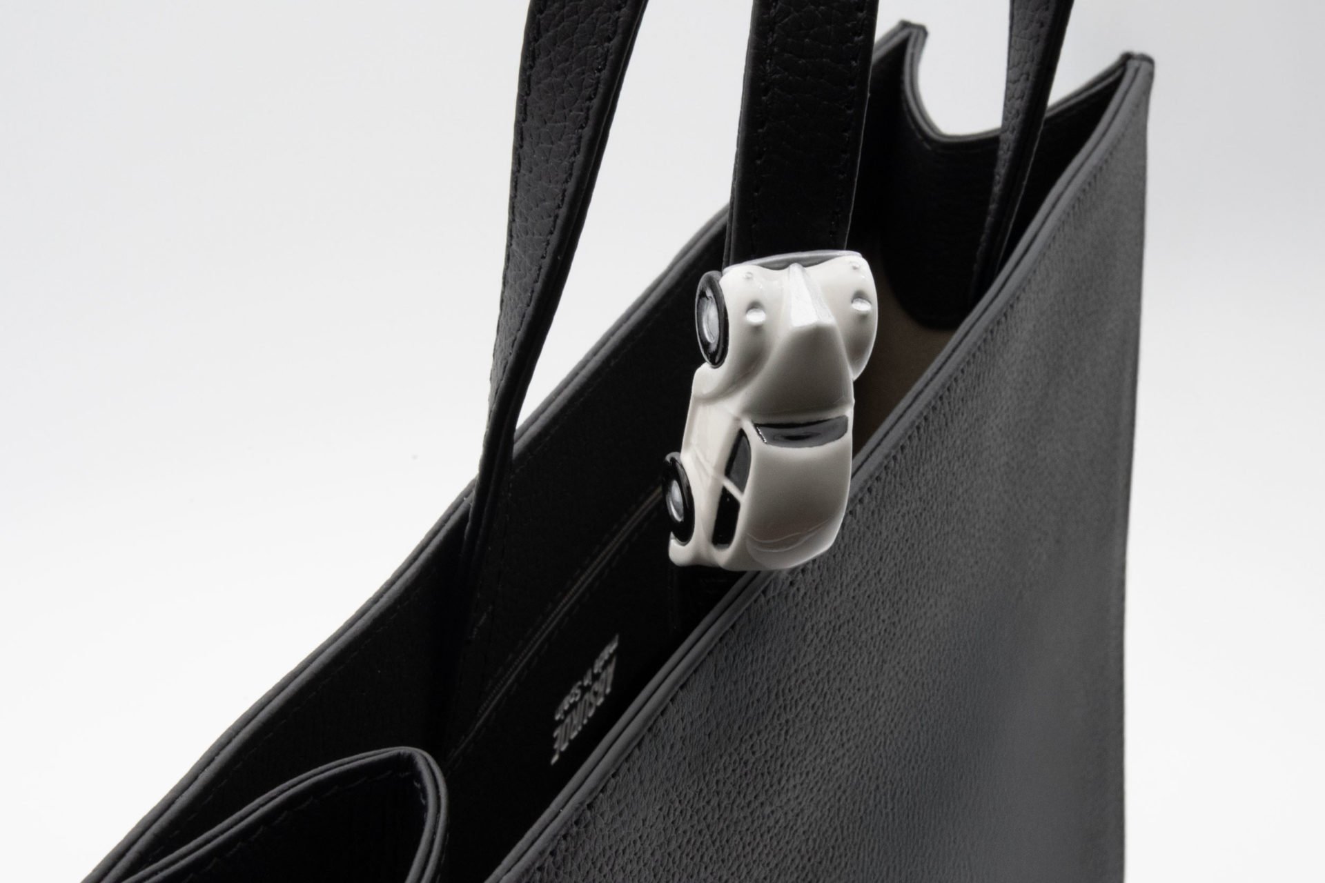 Exclusive black leather tote bag, handcrafted in Ubrique, Spain, combining timeless elegance with modern functionality. Features sturdy top handles, a detachable shoulder strap, and subtle silver hardware with a distinctive white moving metal car. Includes an internal pocket and a spacious interior that fits a 16" laptop. Designed for everyday sophistication with refined craftsmanship and premium materials. Height: 38 cm  Width: 32 cm  Depth: 9 cm Show more