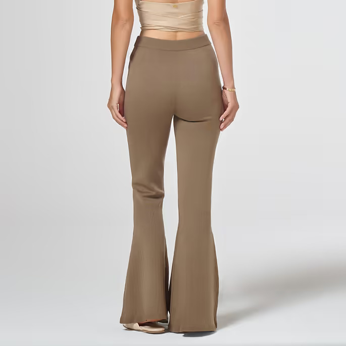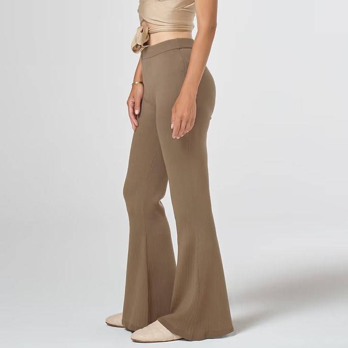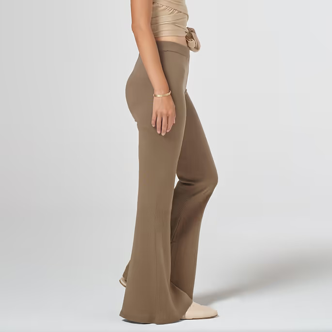 Fitted flared trousers crafted in Lake Como, Italy, from 100% merino wool. Soft, breathable, and naturally flexible, they offer the comfort of yoga pants with an elegant silhouette. Free from polyester and certified by Oeko-TEX Standard 100 and RWS, they are fully biodegradable and gentle on the skin. Perfect for lounging, light stretching, or pairing with a blouse or cropped sweatshirt for effortless sophistication. Dry clean only. All-season wear. Show more