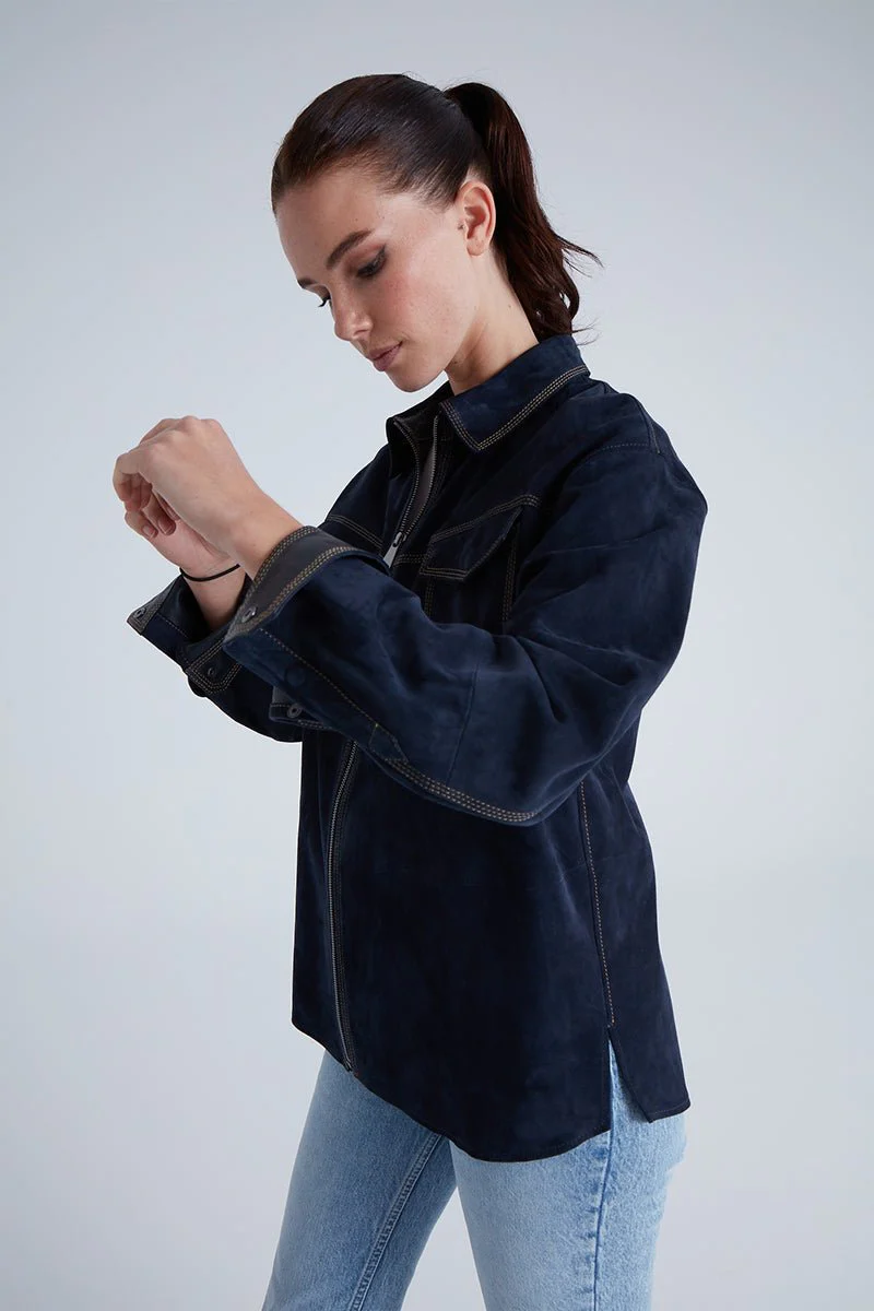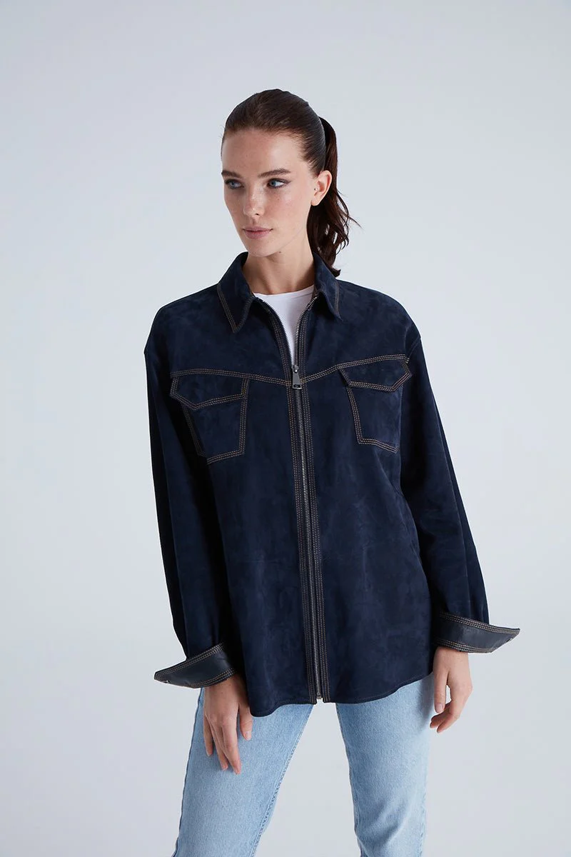 Nika Women’s Suede Leather Shirt – Navy Blue